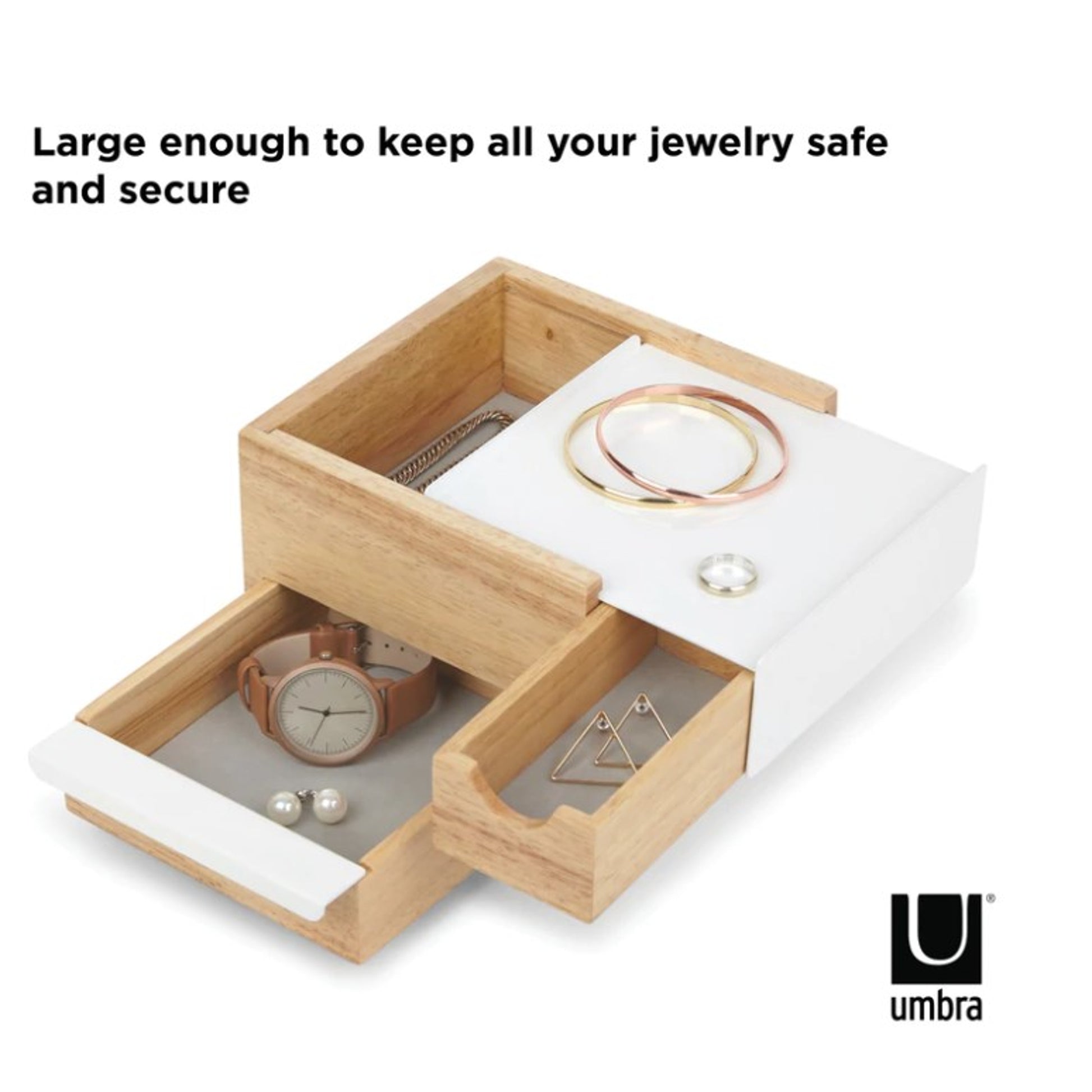 Use o mini Stowit para guardar as suas joias favoritas num só lugar, mantendo-as à mão. Com vários compartimentos escondidos de vários tamanhos, guarde os seus anéis, brincos, pulseiras, relógios, colares e outros acessórios. Cada gaveta é coberta com uma almofada de linho para impedir que as suas joias se movam ou estragam. O design simples e moderno é uma boa adição à sua mesinha de cabeceira, mesa ou armário ou onde a quiser guardar. Mini Stowit tem um acabamento branco com alto brilho e borracha protetora para impedir que os seus móveis fiquem arranhados.