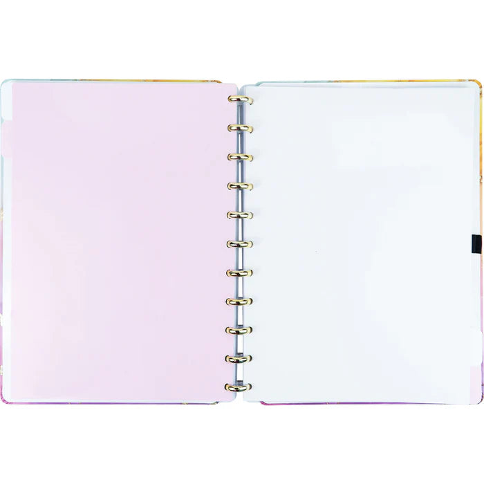 Inspirado na princesa preferida da influencer, a Aurora, este Caderno Inteligente presta-lhe homenagem com uma mistura de cores quentes e luminosas que se dissipam em forma de faixas coloridas e brilhantes! Esta edição especial by Luara inclui uma folha de adesivos.