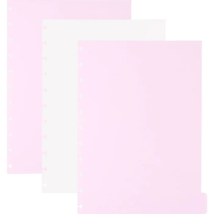 Este caderno é composto por uma capa e contracapa rígidas; uma bolsa plástica (184 x 274 mm); uma folha de instrução de uso com recargas e acessórios da marca disponíveis no verso; uma folha de identificação com calendário no verso; quatro divisórias com abas para identificação (2 brancas e 2 rosa); 80 folhas offset de 90g (60 folhas pautadas e 20 folhas lisas brancas para impressão); um suporte com elástico para caneta ou lápis; e discos M + elástico.