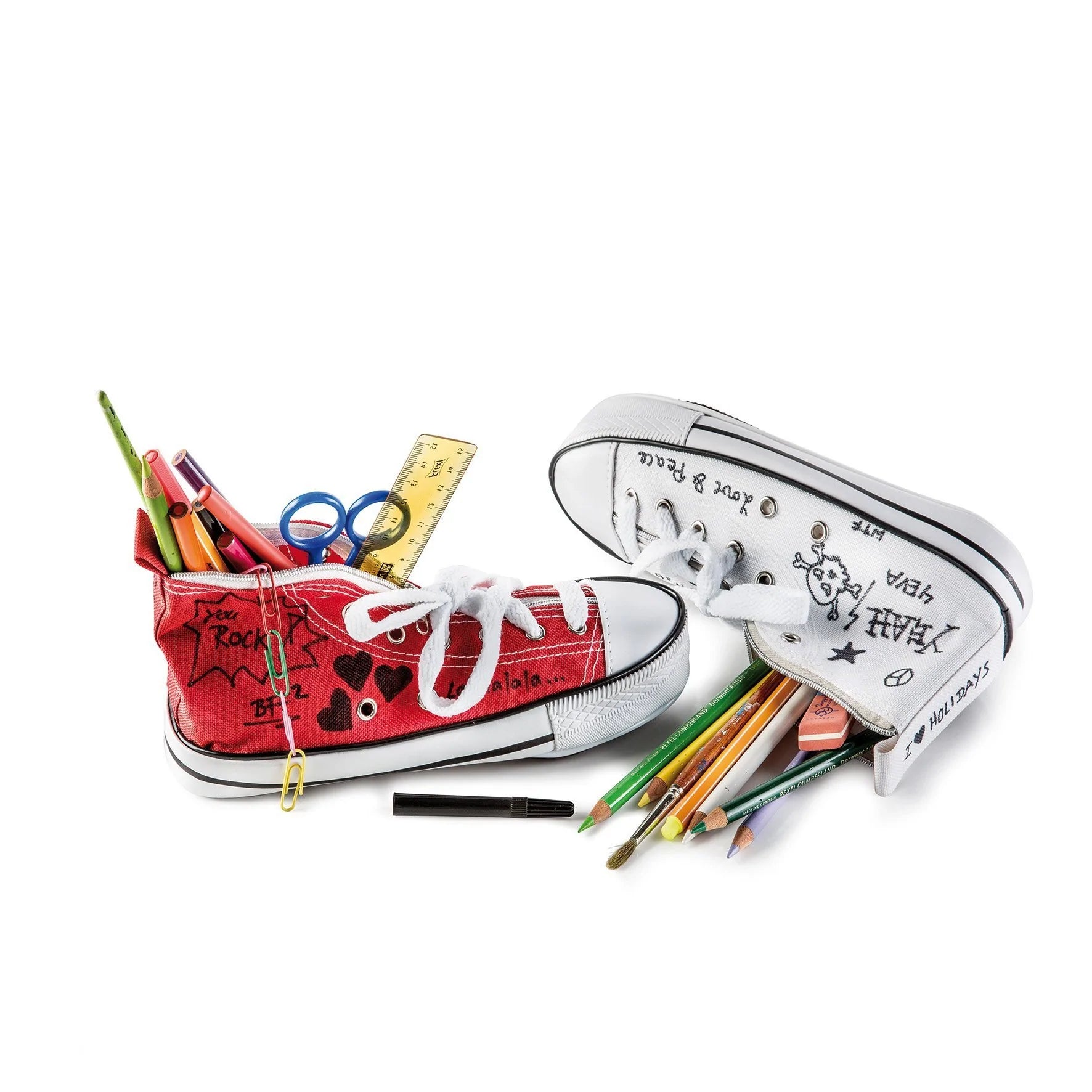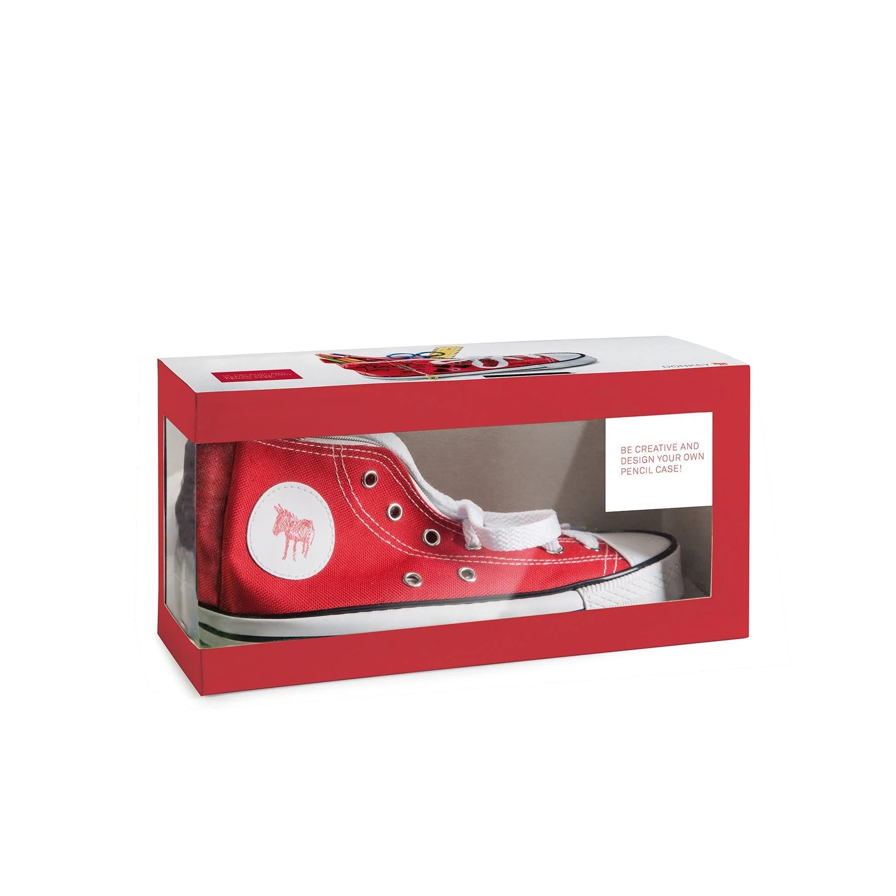 O estojo Donkey Doodle em vermelho não só impressiona pela sua semelhança enganosamente real com o original. O prático espaço interno para guardar utensílios de escritório também convence na linha completa! Você não deve perder este tênis!