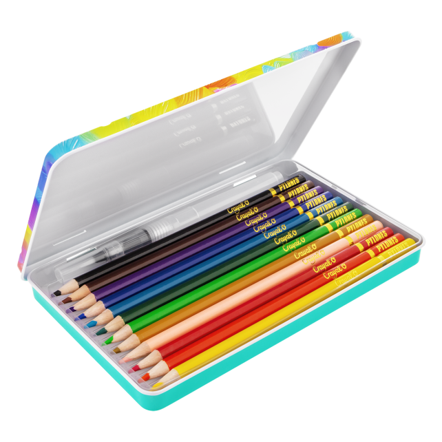 Crayal’o é uma caixa metálica colorida e prática que contém 12 lápis de aguarela intensos. Estes lápis misturam-se facilmente com a água, graças a um pincel com reservatório integrado, criando impressionantes efeitos de aguarela.